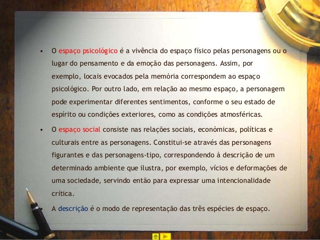 14. 14. • O espaço psicológico é a vivência do espaço físico pelas personagens ou o lugar do pensamento e da emoção das personagens. Assim, por exemplo, locais evocados pela memória correspondem ao espaço psicológico. Por outro lado, em relação ao mesmo espaço, a personagem pode experimentar diferentes sentimentos, conforme o seu estado de espírito ou condições exteriores, como as condições atmosféricas. • O espaço social consiste nas relações sociais, económicas, políticas e culturais entre as personagens. Constitui-se através das personagens figurantes e das personagens-tipo, correspondendo à descrição de um determinado ambiente que ilustra, por exemplo, vícios e deformações de uma sociedade, servindo então para expressar uma intencionalidade crítica. • A descrição é o modo de representação das três espécies de espaço.