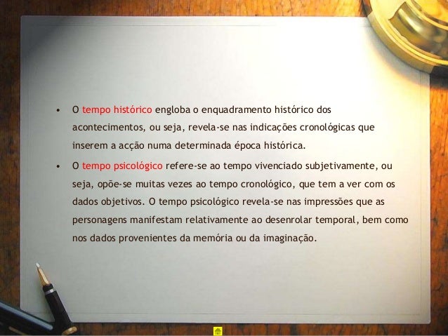 16. 16. • O tempo histórico engloba o enquadramento histórico dos acontecimentos, ou seja, revela-se nas indicações cronológicas que inserem a acção numa determinada época histórica. • O tempo psicológico refere-se ao tempo vivenciado subjetivamente, ou seja, opõe-se muitas vezes ao tempo cronológico, que tem a ver com os dados objetivos. O tempo psicológico revela-se nas impressões que as personagens manifestam relativamente ao desenrolar temporal, bem como nos dados provenientes da memória ou da imaginação.
