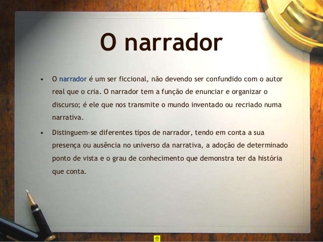 17. 17. O narrador • O narrador é um ser ficcional, não devendo ser confundido com o autor real que o cria. O narrador tem a função de enunciar e organizar o discurso; é ele que nos transmite o mundo inventado ou recriado numa narrativa. • Distinguem-se diferentes tipos de narrador, tendo em conta a sua presença ou ausência no universo da narrativa, a adoção de determinado ponto de vista e o grau de conhecimento que demonstra ter da história que conta.