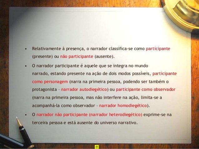 18. 18. • Relativamente à presença, o narrador classifica-se como participante (presente) ou não participante (ausente). • O narrador participante é aquele que se integra no mundo narrado, estando presente na ação de dois modos possíveis, participante como personagem (narra na primeira pessoa, podendo ser também o protagonista – narrador autodiegético) ou participante como observador (narra na primeira pessoa, mas não interfere na ação, limita-se a acompanhá-la como observador – narrador homodiegético). • O narrador não participante (narrador heterodiegético) exprime-se na terceira pessoa e está ausente do universo narrativo.