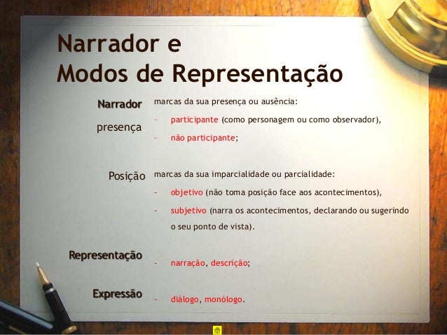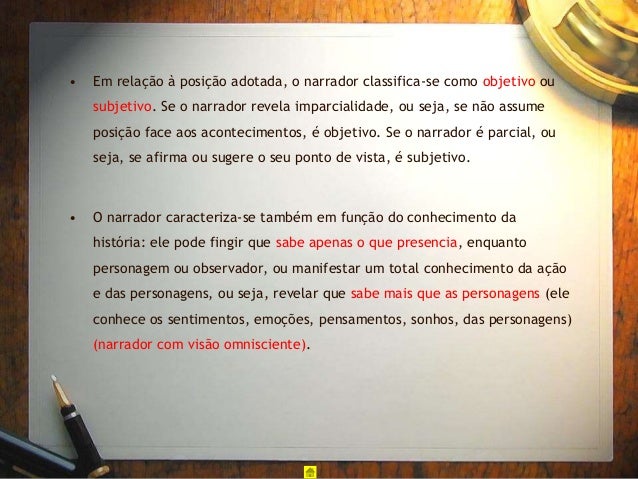 19. 19. • Em relação à posição adotada, o narrador classifica-se como objetivo ou subjetivo. Se o narrador revela imparcialidade, ou seja, se não assume posição face aos acontecimentos, é objetivo. Se o narrador é parcial, ou seja, se afirma ou sugere o seu ponto de vista, é subjetivo. • O narrador caracteriza-se também em função do conhecimento da história: ele pode fingir que sabe apenas o que presencia, enquanto personagem ou observador, ou manifestar um total conhecimento da ação e das personagens, ou seja, revelar que sabe mais que as personagens (ele conhece os sentimentos, emoções, pensamentos, sonhos, das personagens) (narrador com visão omnisciente).
