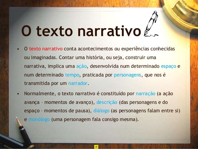2. 2. O texto narrativo • O texto narrativo conta acontecimentos ou experiências conhecidas ou imaginadas. Contar uma história, ou seja, construir uma narrativa, implica uma ação, desenvolvida num determinado espaço e num determinado tempo, praticada por personagens, que nos é transmitida por um narrador. • Normalmente, o texto narrativo é constituído por narração (a ação avança – momentos de avanço), descrição (das personagens e do espaço – momentos de pausa), diálogo (as personagens falam entre si) e monólogo (uma personagem fala consigo mesma).
