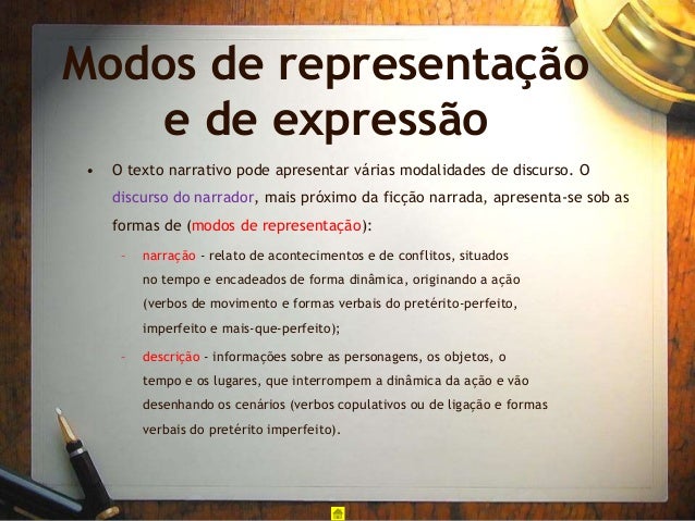 21. 21. Modos de representação e de expressão • O texto narrativo pode apresentar várias modalidades de discurso. O discurso do narrador, mais próximo da ficção narrada, apresenta-se sob as formas de (modos de representação): – narração - relato de acontecimentos e de conflitos, situados no tempo e encadeados de forma dinâmica, originando a ação (verbos de movimento e formas verbais do pretérito-perfeito, imperfeito e mais-que-perfeito); – descrição - informações sobre as personagens, os objetos, o tempo e os lugares, que interrompem a dinâmica da ação e vão desenhando os cenários (verbos copulativos ou de ligação e formas verbais do pretérito imperfeito).