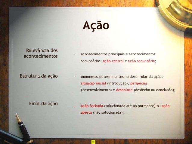 3. 3. Ação Relevância dos acontecimentos - Estrutura da ação - acontecimentos principais e acontecimentos secundários: ação central e ação secundária; momentos determinantes no desenrolar da ação: situação inicial (introdução), peripécias (desenvolvimento) e desenlace (desfecho ou conclusão); Final da ação - ação fechada (solucionada até ao pormenor) ou ação aberta (não solucionada);