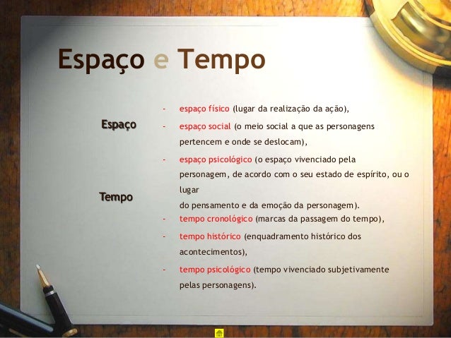 5. 5. Espaço e Tempo ‐ Espaço espaço físico (lugar da realização da ação), ‐ espaço social (o meio social a que as personagens pertencem e onde se deslocam), ‐ espaço psicológico (o espaço vivenciado pela personagem, de acordo com o seu estado de espírito, ou o lugar Tempo do pensamento e da emoção da personagem). ‐ tempo cronológico (marcas da passagem do tempo), ‐ tempo histórico (enquadramento histórico dos acontecimentos), ‐ tempo psicológico (tempo vivenciado subjetivamente pelas personagens).