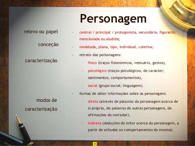6. 6. Personagem relevo ou papel ‐ central / principal / protagonista, secundária, figurante, mencionada ou aludida; conceção ‐ modelada, plana, tipo, individual, coletiva; ‐ retrato das personagens: caracterização – físico (traços fisionómicos, vestuário, gestos), – psicológico (traços psicológicos, de carácter; sentimentos, comportamentos), – ‐ modos de social (grupo social; linguagem); formas de obter informações sobre as personagens: ‐ direta (através de palavras da personagem acerca de si própria, de palavras de outras personagens, de caracterização afirmações do narrador), ‐ indireta (deduções do leitor acerca da personagem, a partir de atitudes ou comportamentos da mesma).