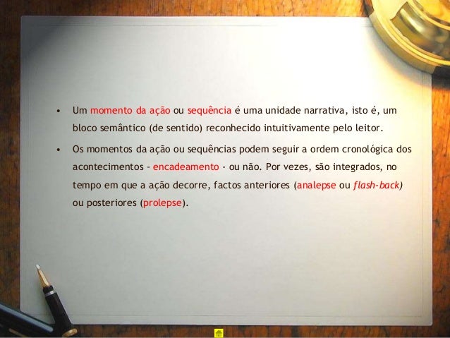 8. 8. • Um momento da ação ou sequência é uma unidade narrativa, isto é, um bloco semântico (de sentido) reconhecido intuitivamente pelo leitor. • Os momentos da ação ou sequências podem seguir a ordem cronológica dos acontecimentos - encadeamento - ou não. Por vezes, são integrados, no tempo em que a ação decorre, factos anteriores (analepse ou flash-back) ou posteriores (prolepse).