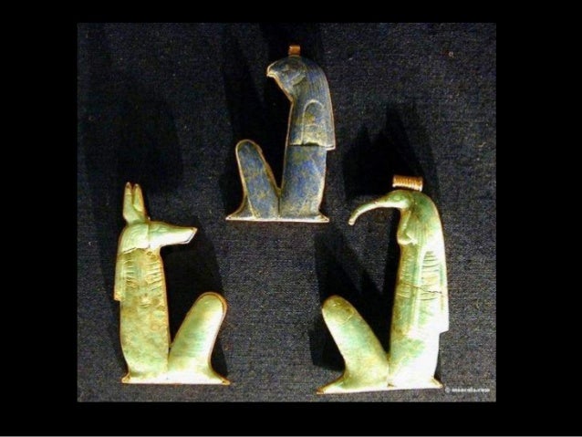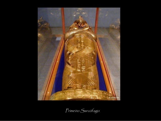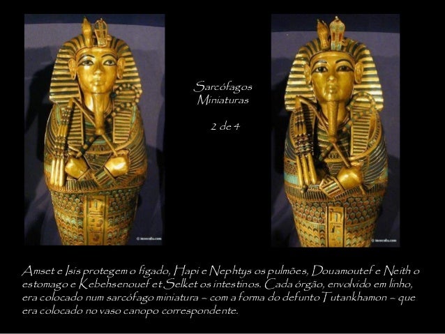15. 15. Amset e Isis protegem o fígado, Hapi e Nephtys os pulmões, Douamoutef e Neith oestomago e Kebehsenouef et Selket os intestinos. Cada órgão, envolvido em linho,era colocado num sarcófago miniatura – com a forma do defuntoTutankhamon – queera colocado no vaso canopo correspondente.SarcófagosMiniaturas2 de 4