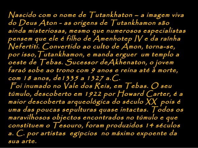 2. 2. Nascido com o nome de Tutankhaton – a imagem vivado Deus Aton - as origens de Tutankhamon sãoainda misteriosas, mesmo que numerosos especialistaspensem que ele é filho de Amenhotep IV e da raínhaNefertiti. Convertido ao culto de Amon, torna-se,por isso,Tutankhamon, e manda erguer um templo aoeste de Tebas. Sucessor deAkhenaton, o jovemfaraó sobe ao trono com 9 anos e reina até à morte,com 18 anos, de1335 a 1327 a.C. Foi inumado no Vale dos Reis, em Tebas. O seutúmulo, descoberto em 1922 por Howard Carter, é amaior descoberta arqueológica do século XX pois éuma das poucas sepulturas quase intactas. Todos osmaravilhosos objectos encontrados no túmulo e queconstituem o Tesouro, foram produzidos 14 séculosa. C. por artistas egípcios no máximo expoente dasua arte.