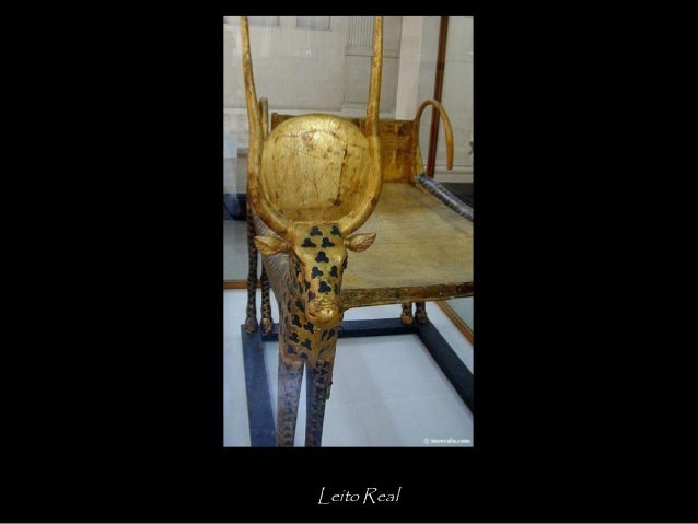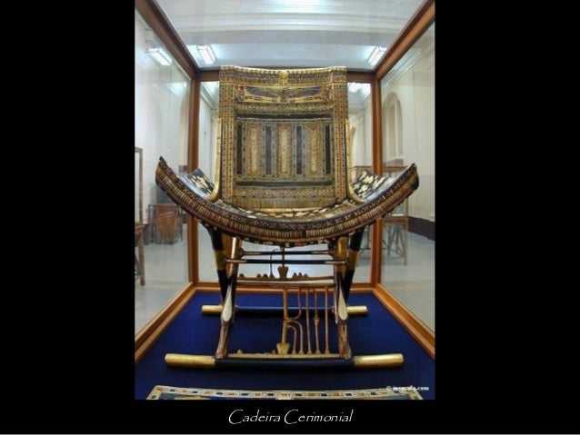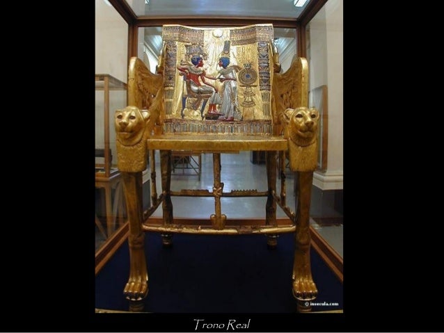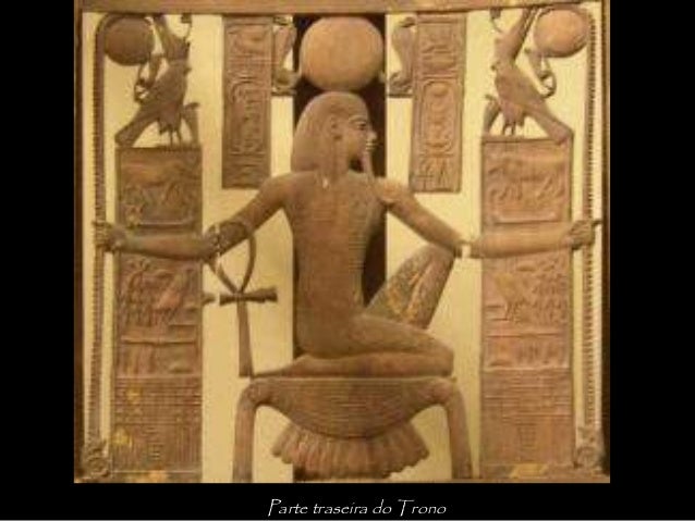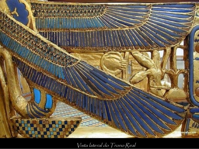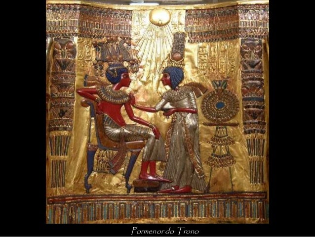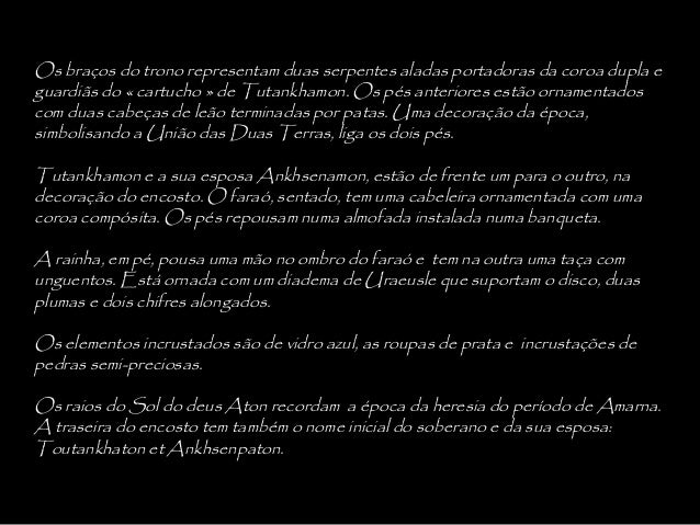 23. 23. Os braços do trono representam duas serpentes aladas portadoras da coroa dupla eguardiãs do « cartucho » de Tutankhamon. Os pés anteriores estão ornamentadoscom duas cabeças de leão terminadas por patas. Uma decoração da época,simbolisando a União das Duas Terras, liga os dois pés.Tutankhamon e a sua esposa Ankhsenamon, estão de frente um para o outro, nadecoração do encosto. O faraó, sentado, tem uma cabeleira ornamentada com umacoroa compósita. Os pés repousam numa almofada instalada numa banqueta.A rainha, em pé, pousa uma mão no ombro do faraó e tem na outra uma taça comunguentos. Está ornada com um diadema de Uraeusle que suportam o disco, duasplumas e dois chifres alongados.Os elementos incrustados são de vidro azul, as roupas de prata e incrustações depedras semi-preciosas.Os raios do Sol do deus Aton recordam a época da heresia do período de Amarna.A traseira do encosto tem também o nome inicial do soberano e da sua esposa:Toutankhaton et Ankhsenpaton.
