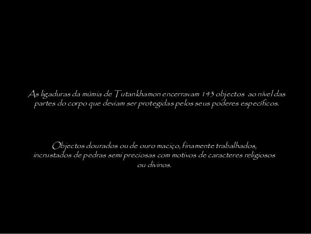 36. 36. As ligaduras da múmia de Tutankhamon encerravam 143 objectos ao nível daspartes do corpo que deviam ser protegidas pelos seus poderes específicos.Objectos dourados ou de ouro maciço, finamente trabalhados,incrustados de pedras semi preciosas com motivos de caracteres religiososou divinos.