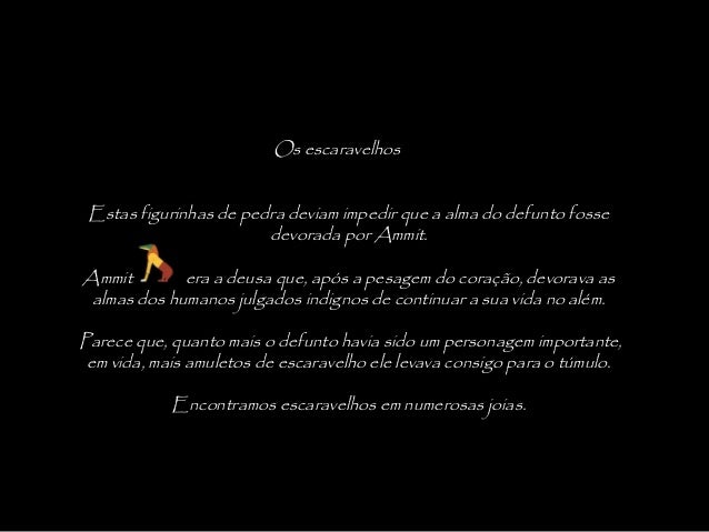 37. 37. Os escaravelhosEstas figurinhas de pedra deviam impedir que a alma do defunto fossedevorada por Ammit.Ammit era a deusa que, após a pesagem do coração, devorava asalmas dos humanos julgados indignos de continuar a sua vida no além. Parece que, quanto mais o defunto havia sido um personagem importante,em vida, mais amuletos de escaravelho ele levava consigo para o túmulo.Encontramos escaravelhos em numerosas joias.