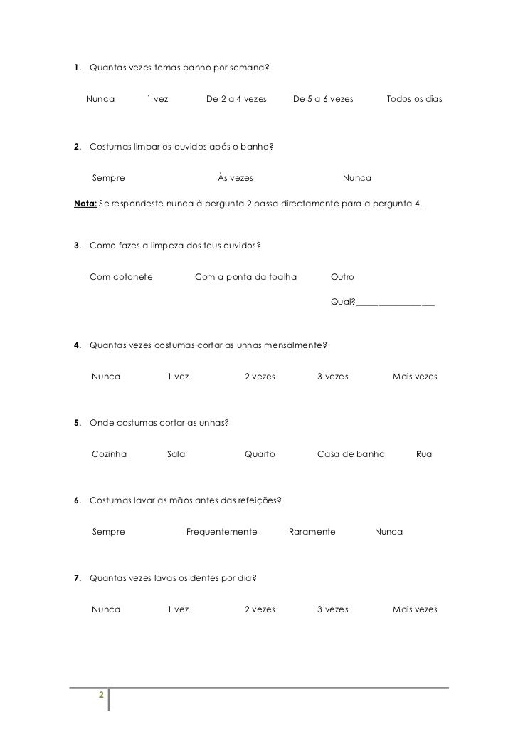 2. 2. 1. Quantas vezes tomas banho por semana? Nunca 1 vez De 2 a 4 vezes De 5 a 6 vezes Todos os dias2. Costumas limpar os ouvidos após o banho? Sempre Às vezes NuncaNota: Se respondeste nunca à pergunta 2 passa directamente para a pergunta 4.3. Como fazes a limpeza dos teus ouvidos? Com cotonete Com a ponta da toalha Outro Qual?__________________4. Quantas vezes costumas cortar as unhas mensalmente? Nunca 1 vez 2 vezes 3 vezes Mais vezes5. Onde costumas cortar as unhas? Cozinha Sala Quarto Casa de banho Rua6. Costumas lavar as mãos antes das refeições? Sempre Frequentemente Raramente Nunca7. Quantas vezes lavas os dentes por dia? Nunca 1 vez 2 vezes 3 vezes Mais vezes 2