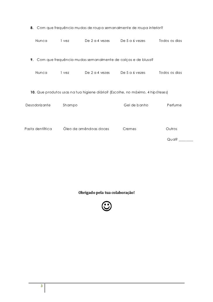 3. 3. 8. Com que frequência mudas de roupa semanalmente de roupa interior? Nunca 1 vez De 2 a 4 vezes De 5 a 6 vezes Todos os dias 9. Com que frequência mudas semanalmente de calças e de blusa? Nunca 1 vez De 2 a 4 vezes De 5 a 6 vezes Todos os dias 10. Que produtos usas na tua higiene diária? (Escolhe, no máximo, 4 hipóteses)Desodorizante Shampo Gel de banho PerfumePasta dentífrica Óleo de amêndoas doces Cremes Outros Qual? ________ Obrigado pela tua colaboração! ☺ 3