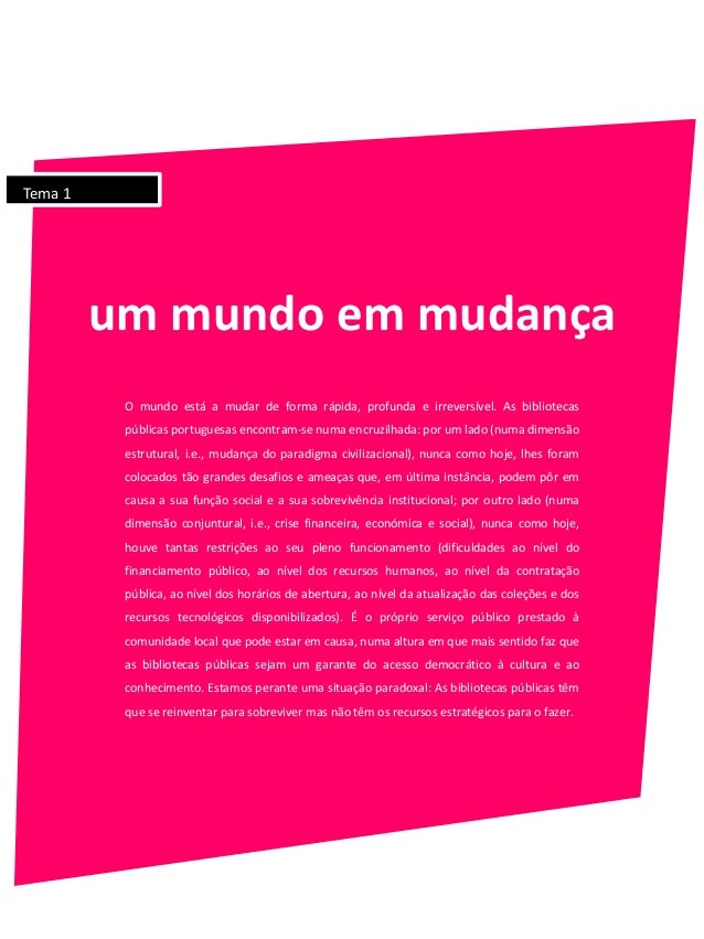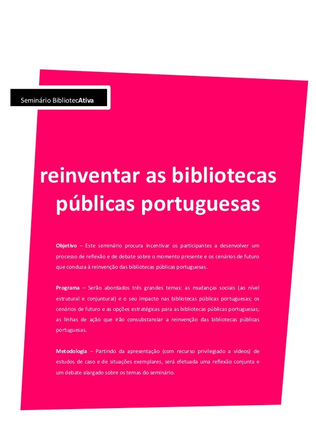 Objetivo – Este seminário procura incentivar os participantes a desenvolver um processo de reflexão e de debate sobre o momento presente e os cenários de futuro que conduza à reinvenção das bibliotecas públicas portuguesas.