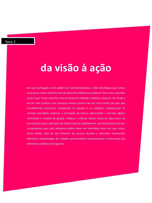 Programa – Serão abordados três grandes temas: as mudanças sociais (ao nível estrutural e conjuntural) e o seu impacto nas bibliotecas públicas portuguesas; os cenários de futuro e as opções estratégicas para as bibliotecas públicas portuguesas; as linhas de ação que irão consubstanciar a reinvenção das bibliotecas públicas portuguesas.