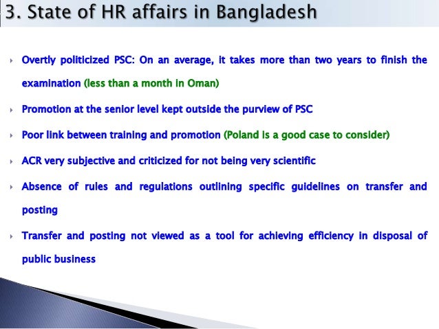 9. 9.  Overtly politicized PSC: On an average, it takes more than two years to finish the examination (less than a month in Oman)  Promotion at the senior level kept outside the purview of PSC  Poor link between training and promotion (Poland is a good case to consider)  ACR very subjective and criticized for not being very scientific  Absence of rules and regulations outlining specific guidelines on transfer and posting  Transfer and posting not viewed as a tool for achieving efficiency in disposal of public business