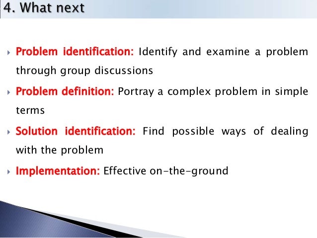 10. 10.  Problem identification: Identify and examine a problem through group discussions  Problem definition: Portray a complex problem in simple terms  Solution identification: Find possible ways of dealing with the problem  Implementation: Effective on-the-ground
