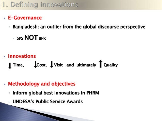 3. 3.  E-Governance ◦ Bangladesh: an outlier from the global discourse perspective  SPS  Innovations Time,  NOT BPR Cost, Visit and ultimately Methodology and objectives ◦ Inform global best innovations in PHRM ◦ UNDESA’s Public Service Awards Quality