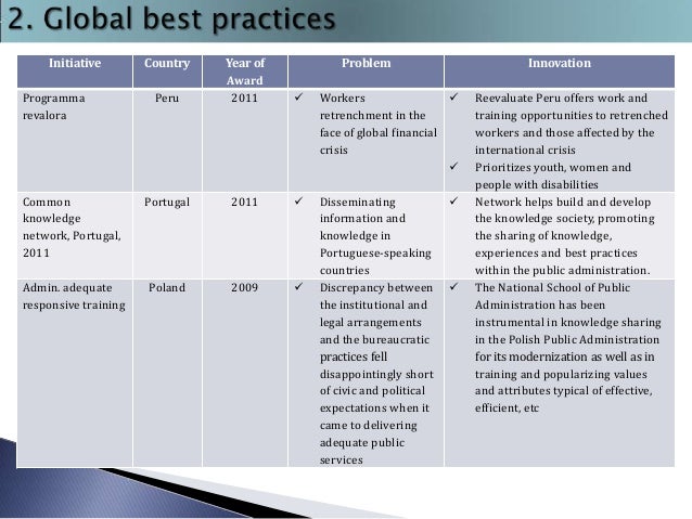 4. 4. Initiative Peru Year of Award 2011  Workers  retrenchment in the face of global financial crisis  Common knowledge network, Portugal, 2011 Portugal 2011  Admin. adequate responsive training Poland 2009  Disseminating information and knowledge in Portuguese-speaking countries Discrepancy between the institutional and legal arrangements and the bureaucratic practices fell disappointingly short of civic and political expectations when it came to delivering adequate public services Programma revalora Country Problem Innovation   Reevaluate Peru offers work and training opportunities to retrenched workers and those affected by the international crisis Prioritizes youth, women and people with disabilities Network helps build and develop the knowledge society, promoting the sharing of knowledge, experiences and best practices within the public administration. The National School of Public Administration has been instrumental in knowledge sharing in the Polish Public Administration for its modernization as well as in training and popularizing values and attributes typical of effective, efficient, etc