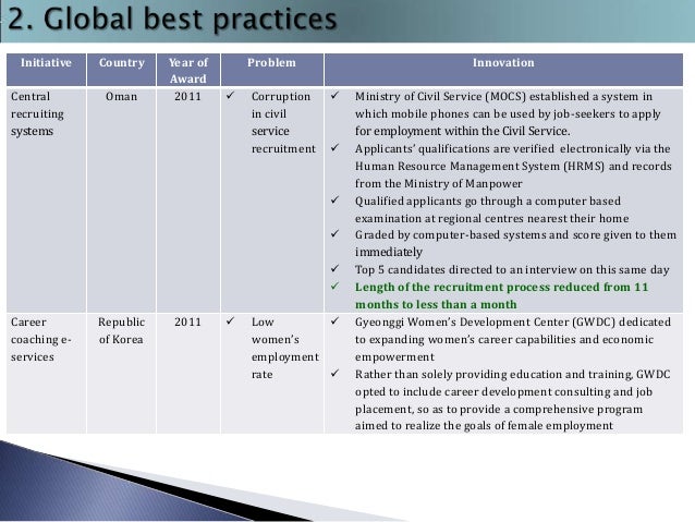 5. 5. Initiative Central recruiting systems Country Oman Year of Award 2011 Problem  Corruption in civil service recruitment Innovation       Career coaching eservices Republic of Korea 2011  Low  women’s employment rate  Ministry of Civil Service (MOCS) established a system in which mobile phones can be used by job-seekers to apply for employment within the Civil Service. Applicants’ qualifications are verified electronically via the Human Resource Management System (HRMS) and records from the Ministry of Manpower Qualified applicants go through a computer based examination at regional centres nearest their home Graded by computer-based systems and score given to them immediately Top 5 candidates directed to an interview on this same day Length of the recruitment process reduced from 11 months to less than a month Gyeonggi Women’s Development Center (GWDC) dedicated to expanding women’s career capabilities and economic empowerment Rather than solely providing education and training, GWDC opted to include career development consulting and job placement, so as to provide a comprehensive program aimed to realize the goals of female employment