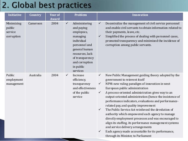 6. 6. Initiative Country Minimizing public service corruption Cameroon Public employment management Australia Year of Award 2004 2004 Problem   Administering and paying employees, managing individual personnel and general human resources, lack of transparency and corruption in public services Increase efficiency, transparency and effectiveness of the public service Innovation        Decentralize the management of civil service personnel and enable civil servants to obtain information related to their payments, leave, etc. Simplified the process of dealing with personnel cases, promoted transparency and minimized the incidence of corruption among public servants. New Public Management guiding theory adopted by the government to reinvent itself NPM: new ruling paradigm of innovation in west European public administration A process-oriented administration gives way to an output-oriented administration (hence the insistence of performance indicators, evaluations and performancerelated pay, and quality improvement The Public Service Act reinforced the devolution of authority which empowered each agency to manage directly employment processes and was encouraged to align its staffing, its performance management systems and service delivery arrangements Each agency made accountable for its performance, through its Minister, to Parliament