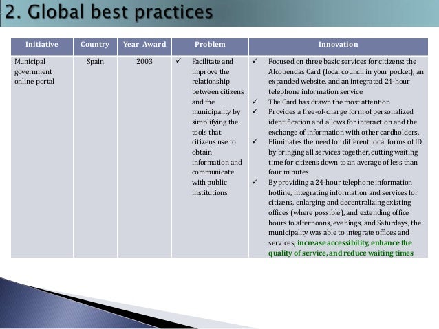 7. 7. Initiative Municipal government online portal Country Year Award Spain 2003 Problem  Facilitate and improve the relationship between citizens and the municipality by simplifying the tools that citizens use to obtain information and communicate with public institutions Innovation      Focused on three basic services for citizens: the Alcobendas Card (local council in your pocket), an expanded website, and an integrated 24-hour telephone information service The Card has drawn the most attention Provides a free-of-charge form of personalized identification and allows for interaction and the exchange of information with other cardholders. Eliminates the need for different local forms of ID by bringing all services together, cutting waiting time for citizens down to an average of less than four minutes By providing a 24-hour telephone information hotline, integrating information and services for citizens, enlarging and decentralizing existing offices (where possible), and extending office hours to afternoons, evenings, and Saturdays, the municipality was able to integrate offices and services, increase accessibility, enhance the quality of service, and reduce waiting times
