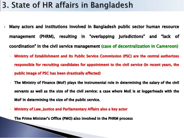 8. 8.  Many actors and institutions involved in Bangladesh public sector human resource management (PHRM), resulting in “overlapping jurisdictions” and “lack of coordination” in the civil service management (case of decentralization in Cameroon) ◦ Ministry of Establishment and its Public Service Commission (PSC) are the central authorizes responsible for recruiting candidates for appointment to the civil service (In recent years, the public image of PSC has been drastically affected) ◦ The Ministry of Finance (MoF) plays the instrumental role in determining the salary of the civil servants as well as the size of the civil service: a case where MoE is at loggerheads with the MoF in determining the size of the public service. ◦ Ministry of Law, Justice and Parliamentary Affairs also a key actor ◦ The Prime Minister’s Office (PMO) also involved in the PHRM process