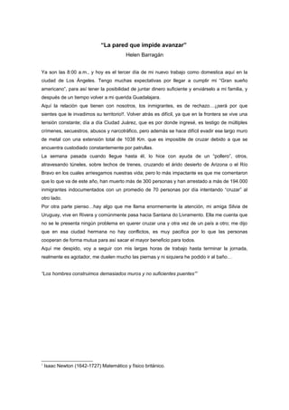 1. 1. “La pared que impide avanzar” Helen BarragánYa son las 8:00 a.m., y hoy es el tercer día de mi nuevo trabajo como domestica aquí en laciudad de Los Ángeles. Tengo muchas expectativas por llegar a cumplir mi “Gran sueñoamericano”, para así tener la posibilidad de juntar dinero suficiente y enviárselo a mi familia, ydespués de un tiempo volver a mi querida Guadalajara.Aquí la relación que tienen con nosotros, los inmigrantes, es de rechazo…¡¡será por quesientes que le invadimos su territorio!!. Volver atrás es difícil, ya que en la frontera se vive unatensión constante; día a día Ciudad Juárez, que es por donde ingresé, es testigo de múltiplescrímenes, secuestros, abusos y narcotráfico, pero además se hace difícil evadir ese largo murode metal con una extensión total de 1038 Km. que es imposible de cruzar debido a que seencuentra custodiado constantemente por patrullas.La semana pasada cuando llegue hasta él, lo hice con ayuda de un “pollero”, otros,atravesando túneles, sobre techos de trenes, cruzando el árido desierto de Arizona o el RíoBravo en los cuales arriesgamos nuestras vida; pero lo más impactante es que me comentaronque lo que va de este año, han muerto más de 300 personas y han arrestado a más de 194.000inmigrantes indocumentados con un promedio de 70 personas por día intentando “cruzar” alotro lado.Por otra parte pienso…hay algo que me llama enormemente la atención, mi amiga Silvia deUruguay, vive en Rivera y comúnmente pasa hacia Santana do Livramento. Ella me cuenta queno se le presenta ningún problema en querer cruzar una y otra vez de un país a otro; me dijoque en esa ciudad hermana no hay conflictos, es muy pacifica por lo que las personascooperan de forma mutua para así sacar el mayor beneficio para todos.Aquí me despido, voy a seguir con mis largas horas de trabajo hasta terminar la jornada,realmente es agotador, me duelen mucho las piernas y ni siquiera he podido ir al baño…“Los hombres construimos demasiados muros y no suficientes puentes” 11 Isaac Newton (1642-1727) Matemático y físico británico.