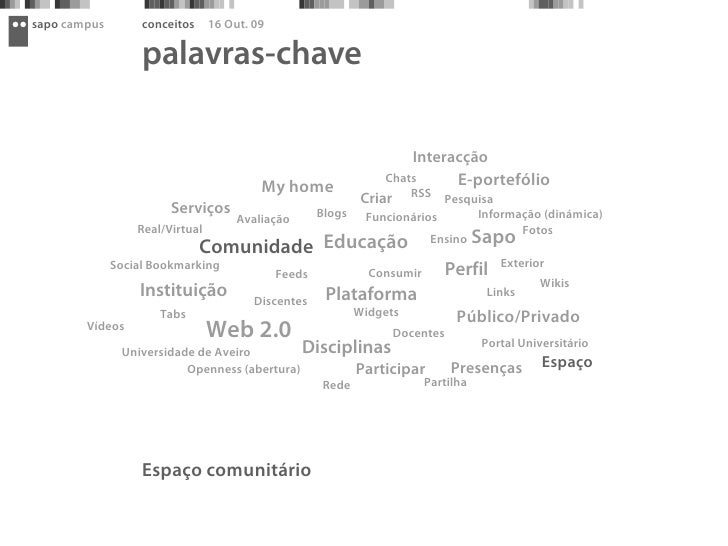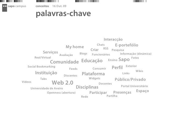 15. 15. sapo campus conceitos 16 Out. 09 palavras-chave Interacção My home Chats E-portefólio RSS Criar Pesquisa Serviços Blogs Funcionários Informação (dinámica) Avaliação Real/Virtual Fotos Comunidade Educação Ensino Sapo Exterior Social Bookmarking Feeds Consumir Perfil Wikis Instituição Discentes Plataforma Links Tabs Widgets Público/Privado Vídeos Web 2.0 Docentes Portal Universitário Universidade de Aveiro Disciplinas Openness (abertura) Participar Presenças Espaço Rede Partilha Espaço comunitário
