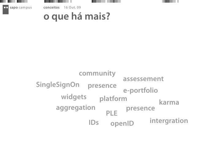 6. 6. sapo campus conceitos 16 Out. 09 o que há mais? community assessement SingleSignOn presence e-portfolio widgets platform karma aggregation presence PLE IDs openID intergration