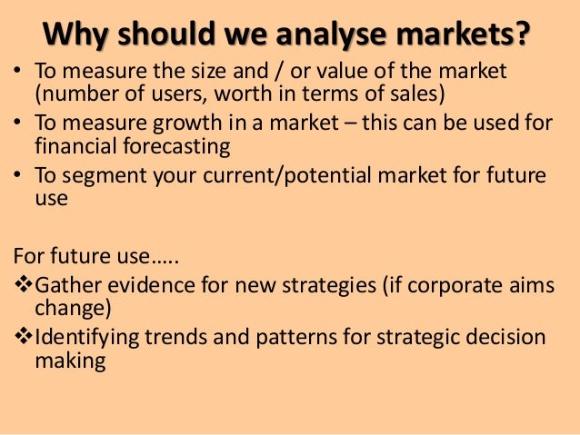 2. 2. Why should we analyse markets? • To measure the size and / or value of the market (number of users, worth in terms of sales) • To measure growth in a market – this can be used for financial forecasting • To segment your current/potential market for future use For future use….. Gather evidence for new strategies (if corporate aims change) Identifying trends and patterns for strategic decision making