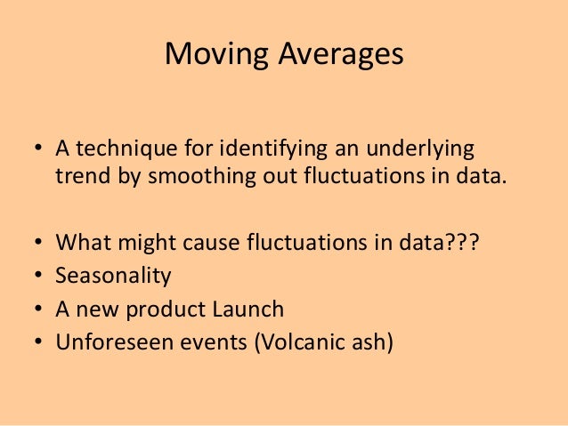 3. 3. Moving Averages • A technique for identifying an underlying trend by smoothing out fluctuations in data. • What might cause fluctuations in data??? • Seasonality • A new product Launch • Unforeseen events (Volcanic ash)