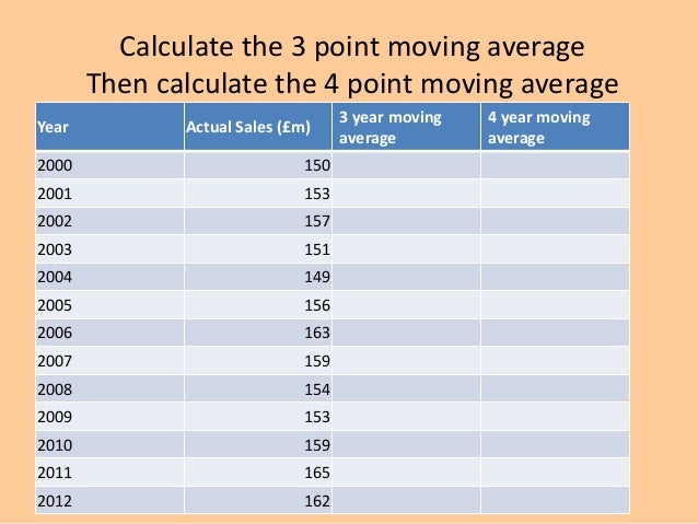 4. 4. Calculate the 3 point moving average Then calculate the 4 point moving average Year Actual Sales (£m) 3 year moving average 4 year moving average 2000 150 2001 153 2002 157 2003 151 2004 149 2005 156 2006 163 2007 159 2008 154 2009 153 2010 159 2011 165 2012 162