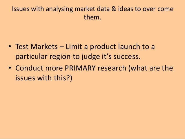 8. 8. Issues with analysing market data & ideas to over come them. • Test Markets – Limit a product launch to a particular region to judge it’s success. • Conduct more PRIMARY research (what are the issues with this?)