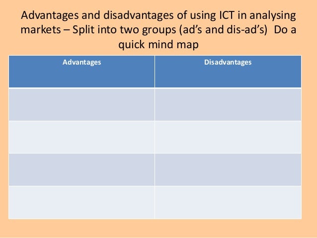 9. 9. Advantages and disadvantages of using ICT in analysing markets – Split into two groups (ad’s and dis-ad’s) Do a quick mind map Advantages Disadvantages