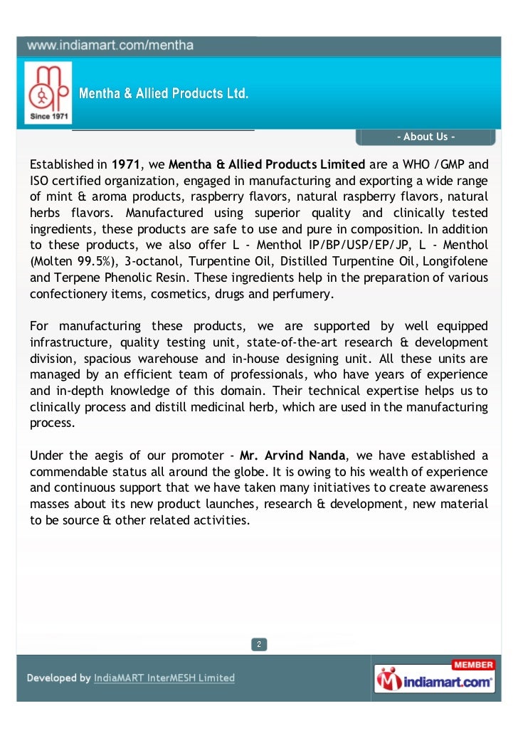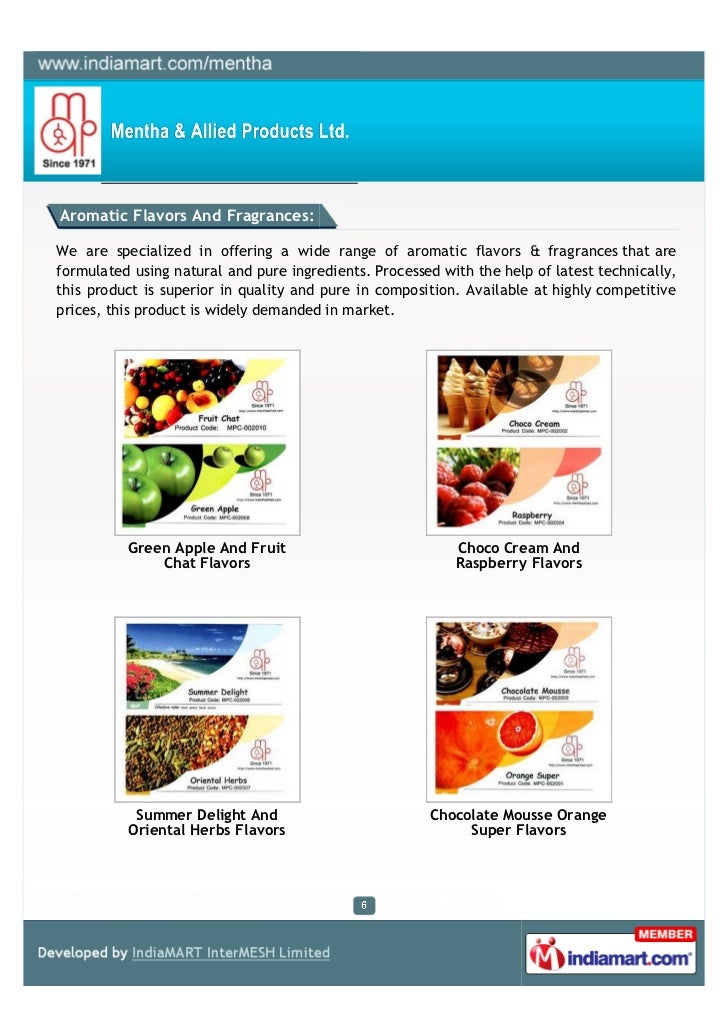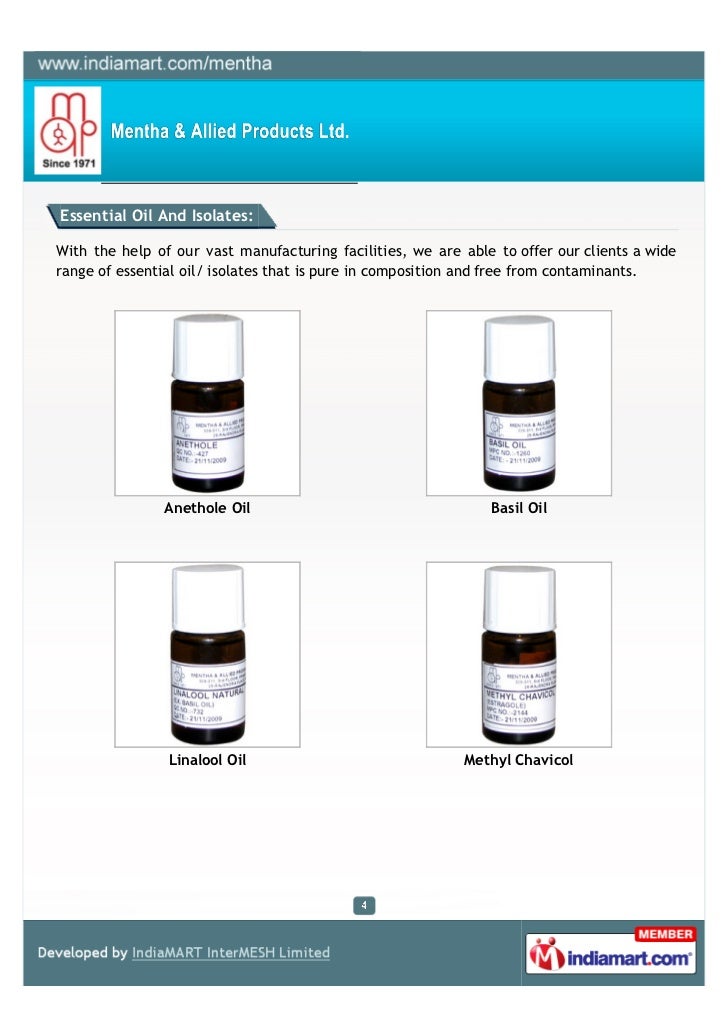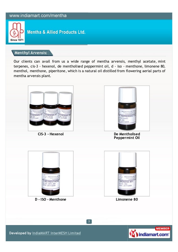 Suppliers and Exporters of CIS-3 - Hexenol, De Mentholised Peppermint Oil, D - ISO - Menthone, Limonene 80, Anethole Oil, Basil Oil, Linalool Oil, Methyl Chavicol.