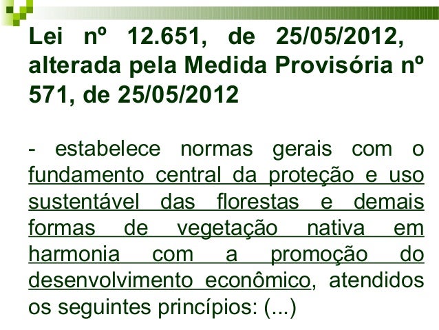 7. 7. Lei nº 12.651, de 25/05/2012, alterada pela Medida Provisória nº 571, de 25/05/2012 - estabelece normas gerais com o fundamento central da proteção e uso sustentável das florestas e demais formas de vegetação nativa em harmonia com a promoção do desenvolvimento econômico, atendidos os seguintes princípios: (...)