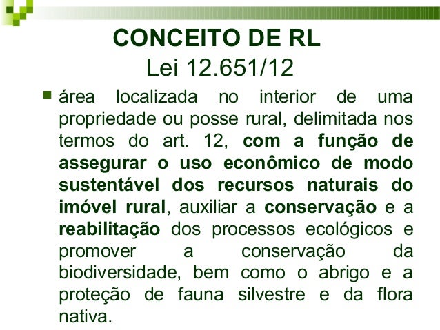 8. 8. CONCEITO DE RL Lei 12.651/12  área localizada no interior de uma propriedade ou posse rural, delimitada nos termos do art. 12, com a função de assegurar o uso econômico de modo sustentável dos recursos naturais do imóvel rural, auxiliar a conservação e a reabilitação dos processos ecológicos e promover a conservação da biodiversidade, bem como o abrigo e a proteção de fauna silvestre e da flora nativa.