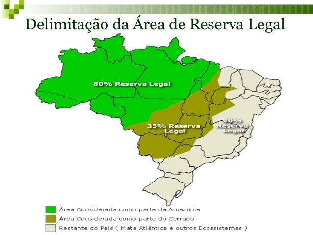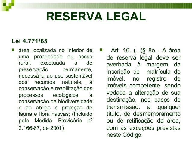 4. 4. RESERVA LEGAL Lei 4.771/65  área localizada no interior de uma propriedade ou posse rural, excetuada a de preservação permanente, necessária ao uso sustentável dos recursos naturais, à conservação e reabilitação dos processos ecológicos, à conservação da biodiversidade e ao abrigo e proteção de fauna e flora nativas; (Incluído pela Medida Provisória nº 2.166-67, de 2001)  Art. 16. (...)§ 8o - A área de reserva legal deve ser averbada à margem da inscrição de matrícula do imóvel, no registro de imóveis competente, sendo vedada a alteração de sua destinação, nos casos de transmissão, a qualquer título, de desmembramento ou de retificação da área, com as exceções previstas neste Código.