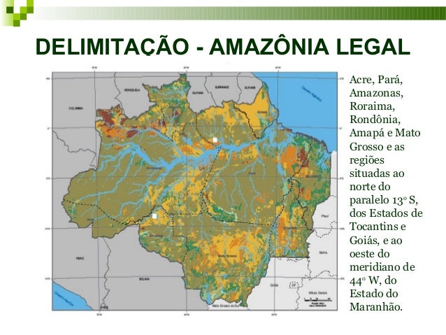 12. 12. DELIMITAÇÃO - AMAZÔNIA LEGAL Acre, Pará, Amazonas, Roraima, Rondônia, Amapá e Mato Grosso e as regiões situadas ao norte do paralelo 13o S, dos Estados de Tocantins e Goiás, e ao oeste do meridiano de 44o W, do Estado do Maranhão.