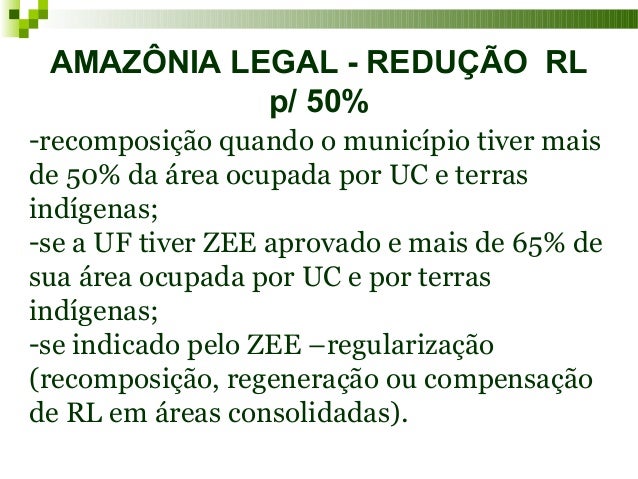 13. 13. AMAZÔNIA LEGAL - REDUÇÃO RL p/ 50% -recomposição quando o município tiver mais de 50% da área ocupada por UC e terras indígenas; -se a UF tiver ZEE aprovado e mais de 65% de sua área ocupada por UC e por terras indígenas; -se indicado pelo ZEE –regularização (recomposição, regeneração ou compensação de RL em áreas consolidadas).