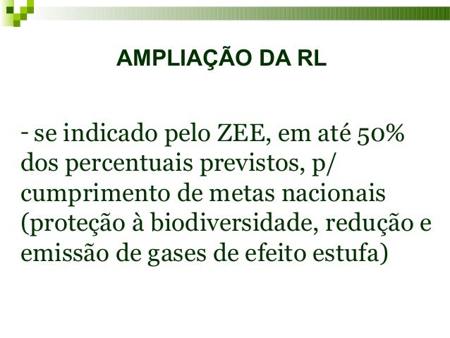 14. 14. AMPLIAÇÃO DA RL - se indicado pelo ZEE, em até 50% dos percentuais previstos, p/ cumprimento de metas nacionais (proteção à biodiversidade, redução e emissão de gases de efeito estufa)