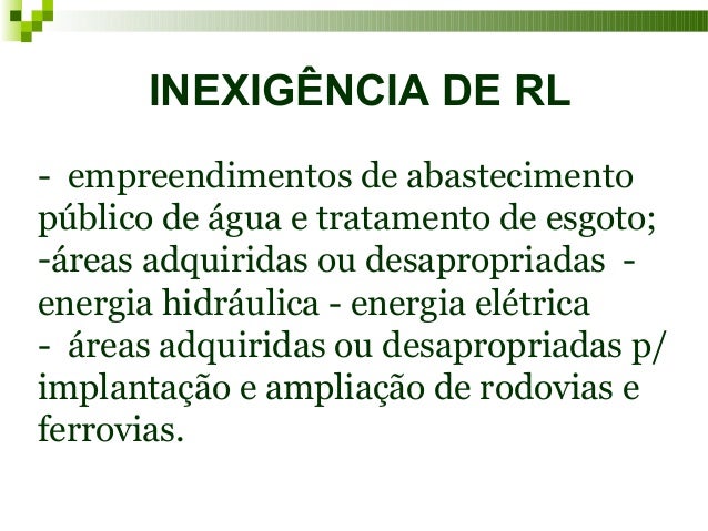 15. 15. INEXIGÊNCIA DE RL - empreendimentos de abastecimento público de água e tratamento de esgoto; -áreas adquiridas ou desapropriadas - energia hidráulica - energia elétrica - áreas adquiridas ou desapropriadas p/ implantação e ampliação de rodovias e ferrovias.