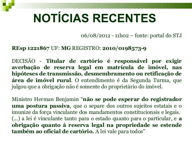 2. 2. NOTÍCIAS RECENTES 06/08/2012 - 11h02 – fonte: portal do STJ REsp 1221867 UF: MG REGISTRO: 2010/0198573-9 DECISÃO - Titular de cartório é responsável por exigir averbação de reserva legal em matrícula de imóvel, nas hipóteses de transmissão, desmembramento ou retificação de área de imóvel rural. O entendimento é da Segunda Turma, que julgou que a obrigação não é somente do proprietário do imóvel. Ministro Herman Benjamin “não se pode esperar do registrador uma postura passiva, que o separe dos outros sujeitos estatais e o imunize da força vinculante dos mandamentos constitucionais e legais. (...) a lei é vinculante tanto para o estado quanto para o particular, e a obrigação quanto à reserva legal na propriedade se estende também ao oficial de cartório. A lei vale para todos”