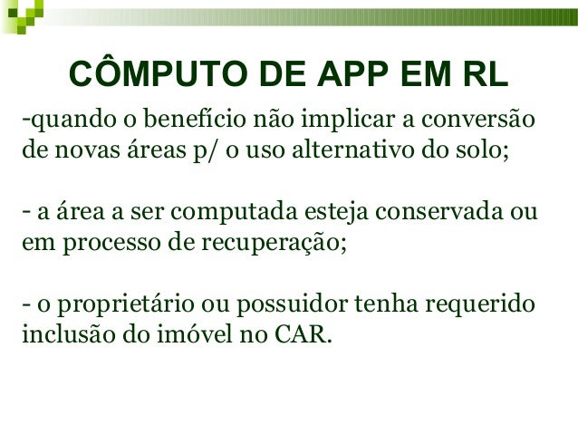 17. 17. CÔMPUTO DE APP EM RL -quando o benefício não implicar a conversão de novas áreas p/ o uso alternativo do solo; - a área a ser computada esteja conservada ou em processo de recuperação; - o proprietário ou possuidor tenha requerido inclusão do imóvel no CAR.