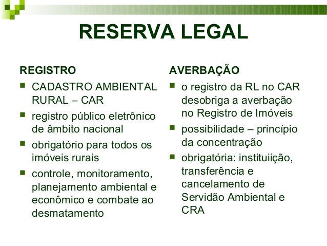 20. 20. RESERVA LEGAL REGISTRO  CADASTRO AMBIENTAL RURAL – CAR  registro público eletrônico de âmbito nacional  obrigatório para todos os imóveis rurais  controle, monitoramento, planejamento ambiental e econômico e combate ao desmatamento AVERBAÇÃO  o registro da RL no CAR desobriga a averbação no Registro de Imóveis  possibilidade – princípio da concentração  obrigatória: instituiição, transferência e cancelamento de Servidão Ambiental e CRA