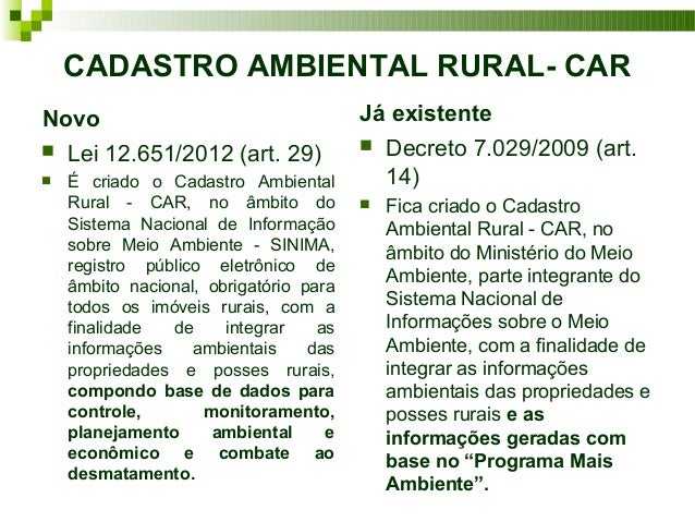 21. 21. CADASTRO AMBIENTAL RURAL- CAR Novo  Lei 12.651/2012 (art. 29)  É criado o Cadastro Ambiental Rural - CAR, no âmbito do Sistema Nacional de Informação sobre Meio Ambiente - SINIMA, registro público eletrônico de âmbito nacional, obrigatório para todos os imóveis rurais, com a finalidade de integrar as informações ambientais das propriedades e posses rurais, compondo base de dados para controle, monitoramento, planejamento ambiental e econômico e combate ao desmatamento. Já existente  Decreto 7.029/2009 (art. 14)  Fica criado o Cadastro Ambiental Rural - CAR, no âmbito do Ministério do Meio Ambiente, parte integrante do Sistema Nacional de Informações sobre o Meio Ambiente, com a finalidade de integrar as informações ambientais das propriedades e posses rurais e as informações geradas com base no “Programa Mais Ambiente”.