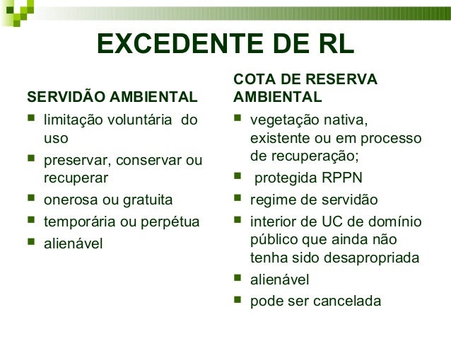 22. 22. EXCEDENTE DE RL SERVIDÃO AMBIENTAL  limitação voluntária do uso  preservar, conservar ou recuperar  onerosa ou gratuita  temporária ou perpétua  alienável COTA DE RESERVA AMBIENTAL  vegetação nativa, existente ou em processo de recuperação;  protegida RPPN  regime de servidão  interior de UC de domínio público que ainda não tenha sido desapropriada  alienável  pode ser cancelada