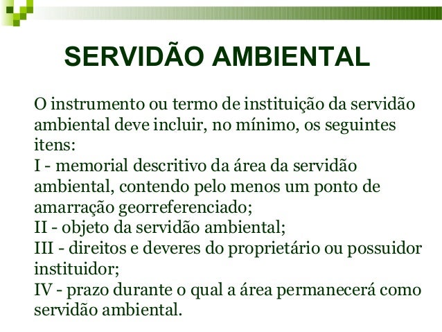 23. 23. SERVIDÃO AMBIENTAL O instrumento ou termo de instituição da servidão ambiental deve incluir, no mínimo, os seguintes itens: I - memorial descritivo da área da servidão ambiental, contendo pelo menos um ponto de amarração georreferenciado; II - objeto da servidão ambiental; III - direitos e deveres do proprietário ou possuidor instituidor; IV - prazo durante o qual a área permanecerá como servidão ambiental.